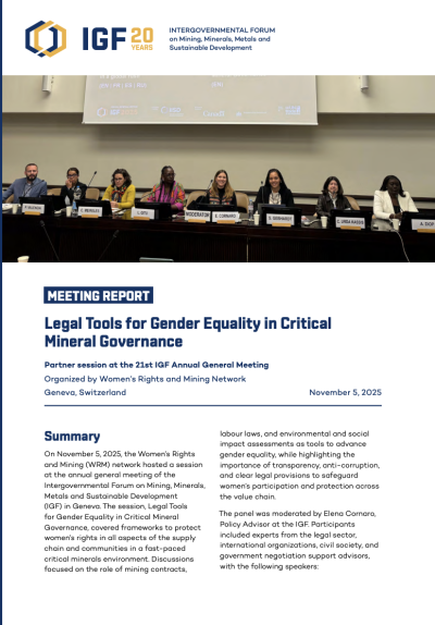 On November 5, 2025, the Women’s Rights and Mining (WRM) network hosted a session at the annual general meeting of the IGF in Geneva. The session, Legal Tools for Gender Equality in Critical Mineral Governance, covered frameworks to protect women’s rights in all aspects of the supply chain and communities in a fast-paced critical minerals environment.